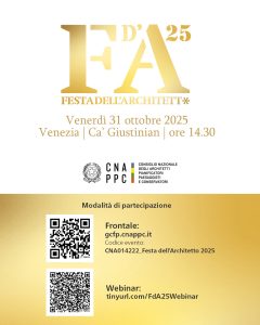 La Festa dell’Architetto 2025 avrà luogo a Venezia venerdì 31 ottobre 2025 presso Cà Giustinian, sede de La Biennale di Venezia. La partecipazione all’evento è in modalità frontale e webinar con il riconoscimento di 5 CFP DEONTOLOGICI. Nella Circolare n.100 del CNAPPC sono riportate in dettaglio le indicazioni per la registrazione in presenza e in webinar.